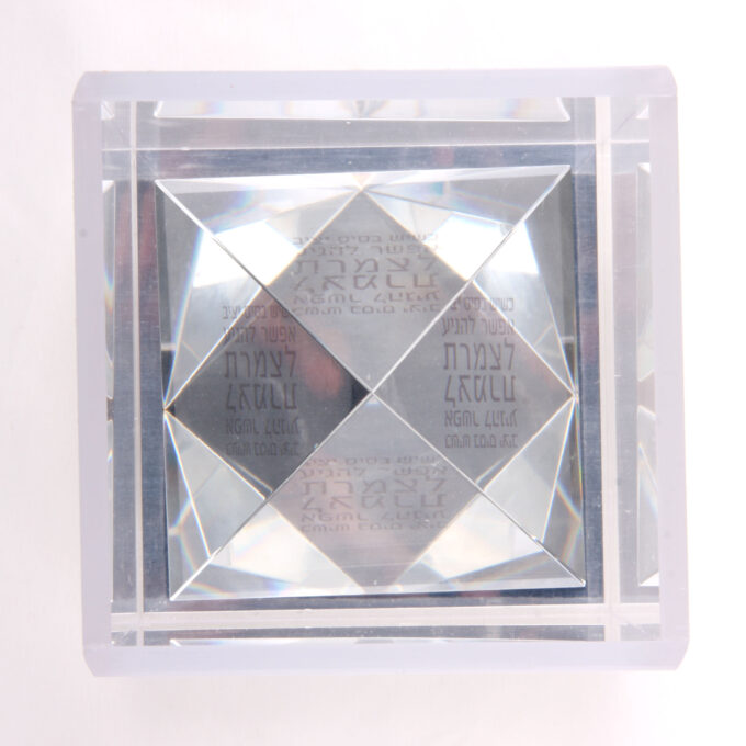 תיאור: פירמידה מזכוכית קריסטלית שבתוכה מרחף המסר. מגיעה בתוך קופסה שקופה מפרספקס בגודל 10 על 10 גובה 12 סמ.